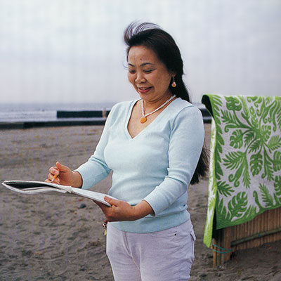 1952年生まれ、湘南育ち。サーフボード職人のご主人とともに25年前、鵠沼にサーフショップを開き、10年前にハワイアンキルト教室「ホクレアマミーズクラフト」を開講。ヴォーグ学園東京校、日本テレビ読売文化センター、ヨークカルチャーセンターなど多数の教室で、ハワイアンキルトの普及に務めている。2000年より、毎年ハワイアンキルト展を開催。著書に『はじめてのパッチワーク ハワイアンキルト』(小社刊)、『ハワイアンキルト・バイブルvol.1~4』(枻出版社刊)。