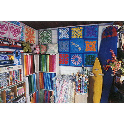 ハワイアンファブリックやキルトグッズが所狭しと並んでいる店内。キルトやサーフボードも。