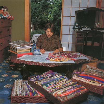 お店・自宅のどこもが、アトリエ化してしまう。お気に入りの縮緬をコレクションしてある自宅の和室で布合わせをする丸屋さん。