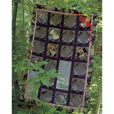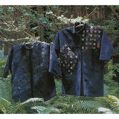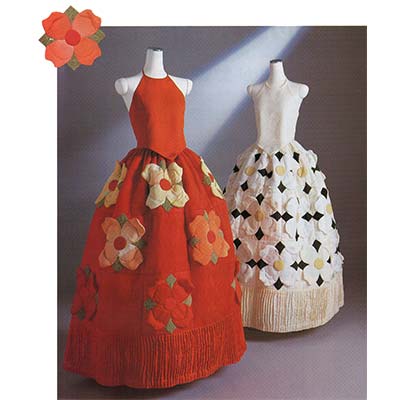 上質な和布素材のキルトウェアは軽くて身体になじむ。1988年大阪帝国ホテルで、1999年東京帝国ホテルで、キルターとしては初のウェアラブルキルトのファッションショーを主催。写真の2点は丹後縮緬、鬼縮緬、紅絹で創作したドレス。