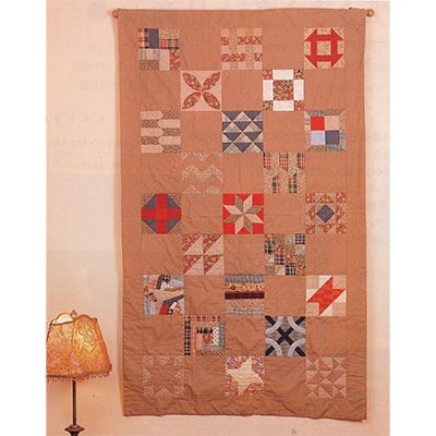 パッチワークの本がまだあまりなかった頃、洋裁学校に通っていた昼休みに、友達から古着や洋裁の裁ちクズをもらって縫ったというファーストキルト。モンキーレンチ、レモンスター、ログキャビンなどの伝統的なパターンを規則的に並べた、素朴で温かみが感じられるキルトだ。