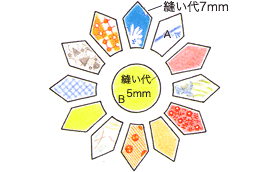 1縫い代は、A布(花びら)は7mm、B布(花芯)は5mmつけます。縫う前に花びらのピースを環状に並べて色合いや配色を見ます。