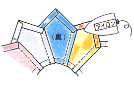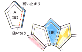 2図のようにA布の花びらを中表にして縫い合わせ、縫い代は一方方向に倒します。