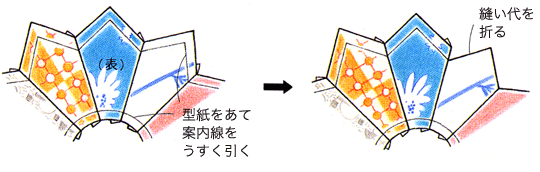 7なじませたら、裏布を図のようにまつります。表に返し、はぎ合わせた部分に落としキルトをします。
