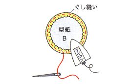 5花芯の縫い代をぐし縫いして、中に型紙を入れて絞り、アイロンをかけます。