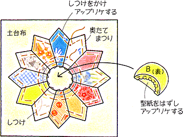 6土台布に花びらを置き、しつけをかけて奥たてまつりでアップリケします。花芯の型紙をはずし、花びらの中心にアップリケをします。