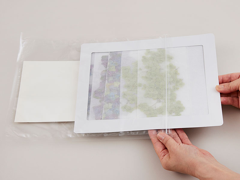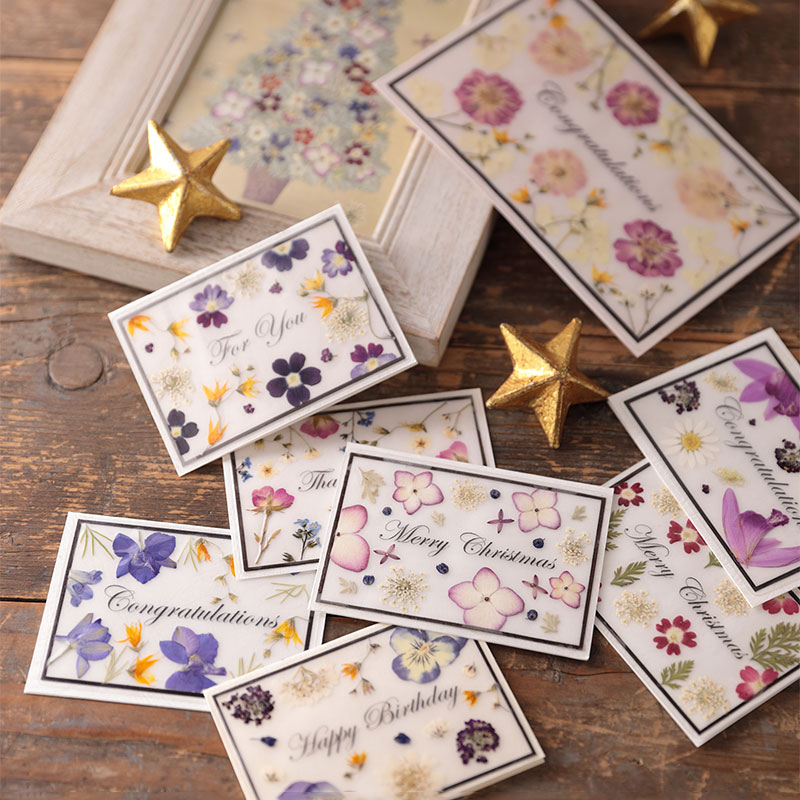 出来上がった押し花は、はがきにあしらったり、絵画のように見せたり、ガラスにはさんだりとその表現方法もさまざまです。