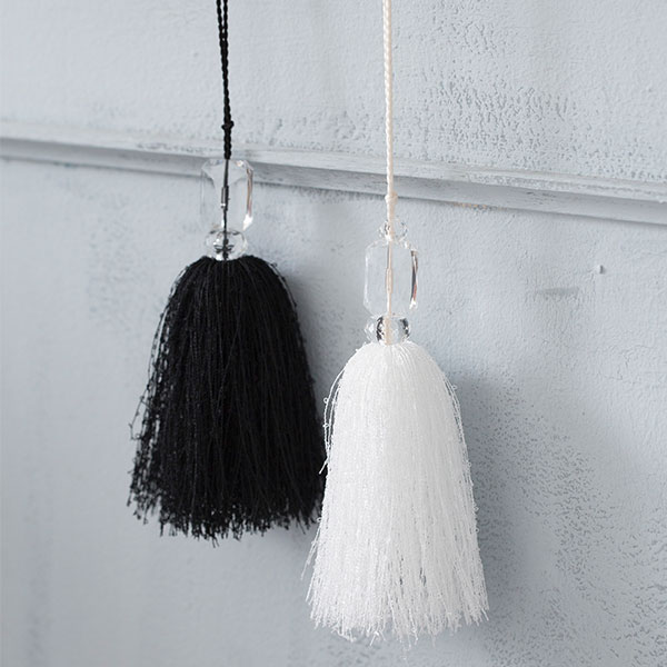 リュミエールフランス語で「光」という意味のリュミエール。ファンシーヤーンと煌めきが美しいカットビーズを使って作るボリュームタッセルです。ホワイトとブラックから選べます。