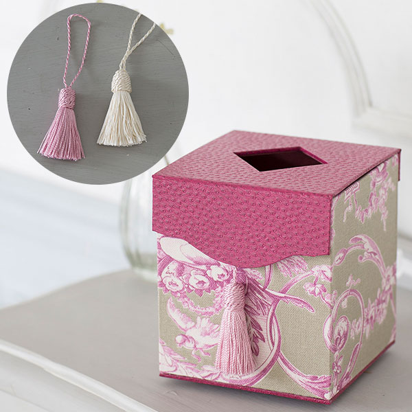 ティッシュBOX(キューブ型)スタイリッシュでスペースをとらないキューブ型のティッシュBOX。スキバルテックスを使用し、また脚やマグネットなどの金具もつけて、本格的な仕上がりになります。シャポー・ド・ノワフランス語で「木の実の帽子」という名の愛らしいタッセル。基本のタッセルのヘッドに飾りをつけたアレンジ作品です。ティッシュBOXのふたにつけます。