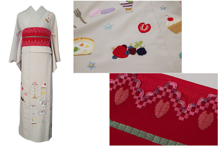 23種のステッチで無地の着物にティーセットやスイーツを刺しゅうしました。ハーダンガー刺しゅうでハートを描いた半幅帯も手作りです。