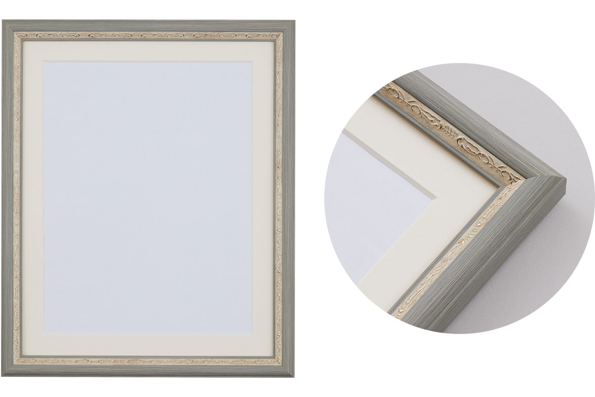 デザイン面:中マットあり30×23・中マットなし35.8×28.8cm少し青みがかったブルーグレーはどんな作品にも合わせやすそうです。●フレーム:色/ブルーグレー×ゴールド、素材/樹脂●中マット:クリーム●ガラスつき