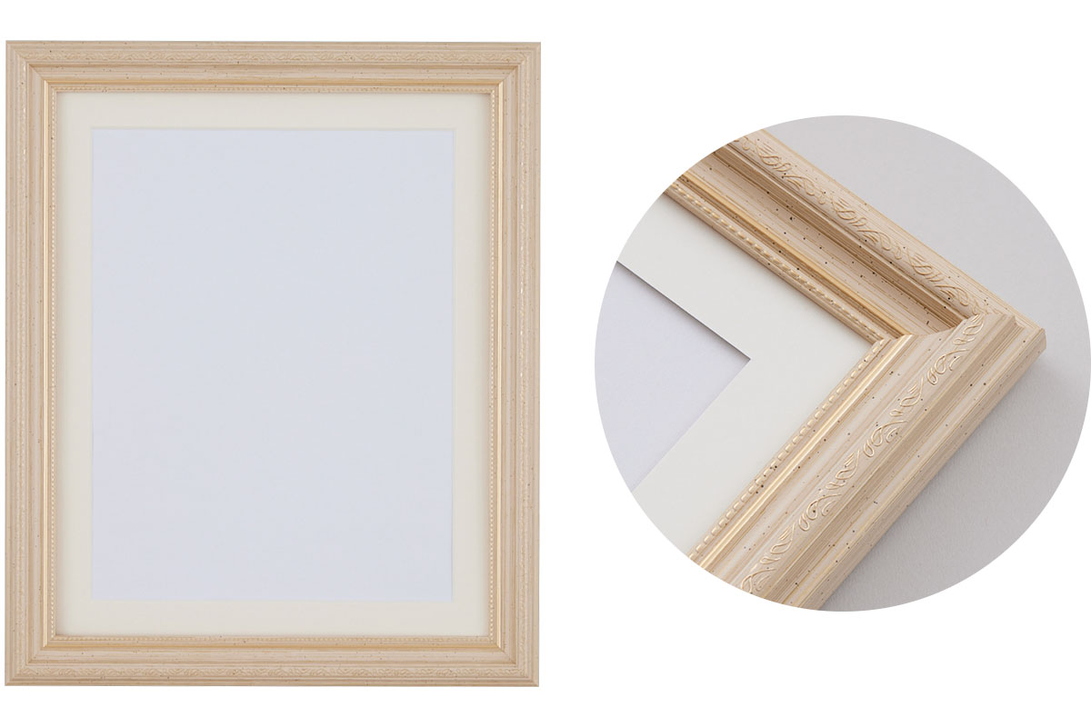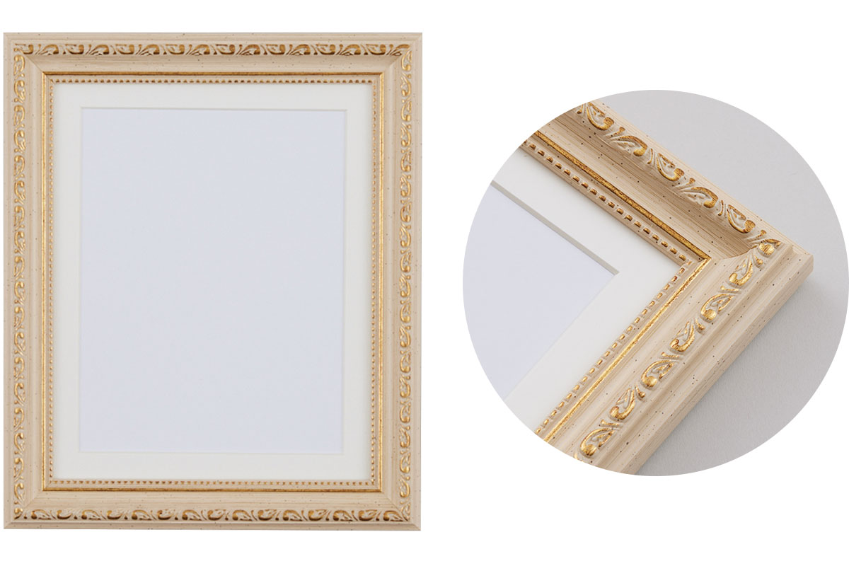 デザイン面:中マットあり21.6×16.6・中マットなし26.2×21.2cmアイボリーの柔らかい色みと、ゴールドの華やかさが作品を引き立ててくれます。●フレーム:色/ベージュ×ゴールド、素材/樹脂●中マット:クリーム●ガラスつき