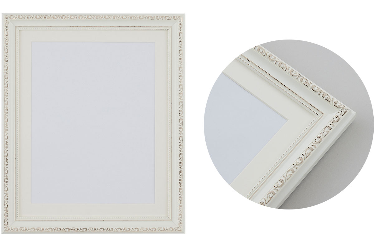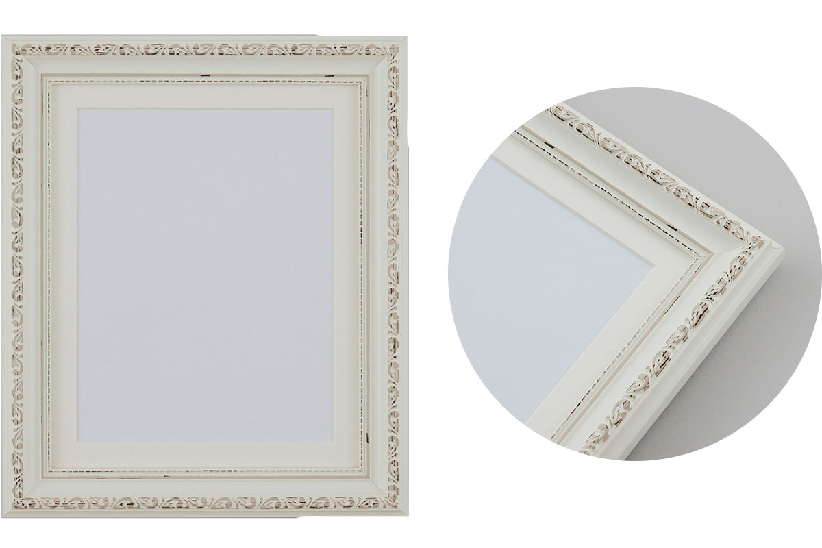 デザイン面:中マットあり 21.6×16.6cm・中マットなし 26.2×21.2cmやわらかい白色に連続模様の装飾の入った額。作品をより引き立ててくれます。●フレーム:色/ホワイト×ブラウン、素材/樹脂●中マット:クリーム●ガラス・スタンドつき