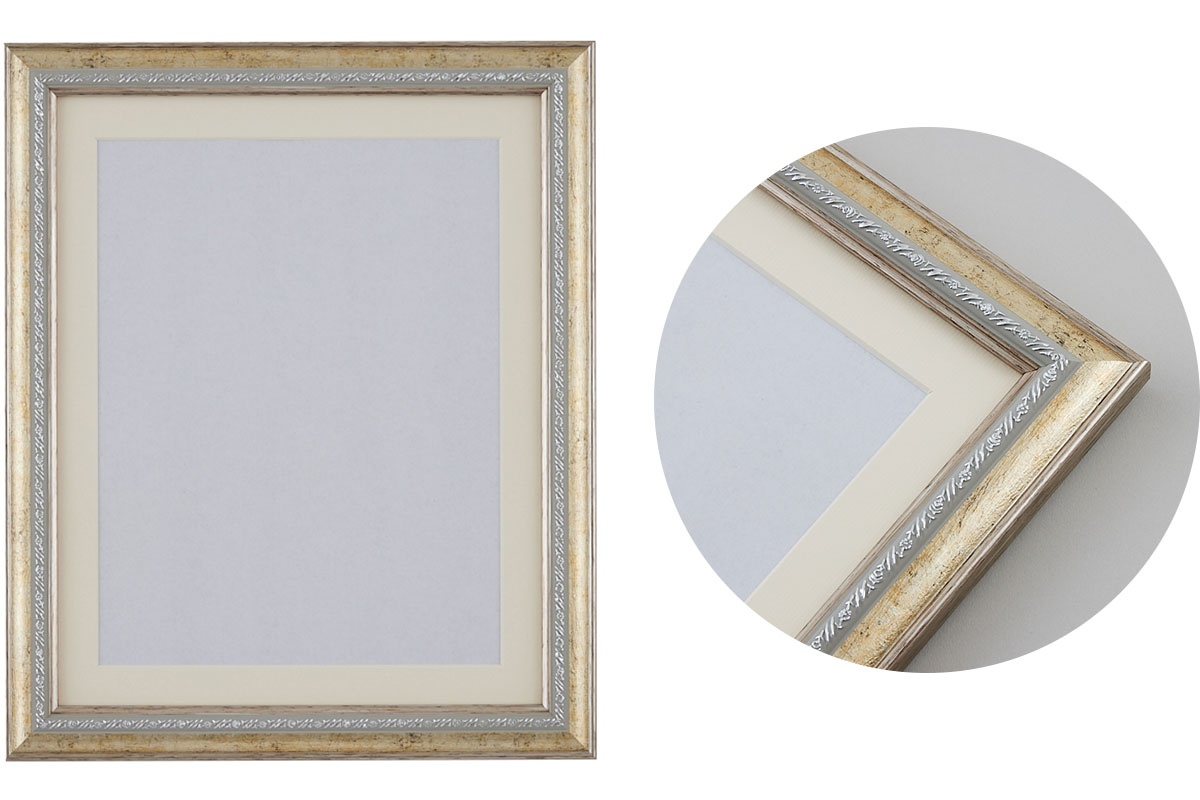 デザイン面:中マットあり 30×23cm・中マットなし 35.8×28.8cmつや消しタイプのゴールドとシルバーで縁取った、落ち着いた雰囲気が魅力です。●フレーム:色/ゴールド×シルバー、素材/樹脂●中マット/クリーム●ガラスつき