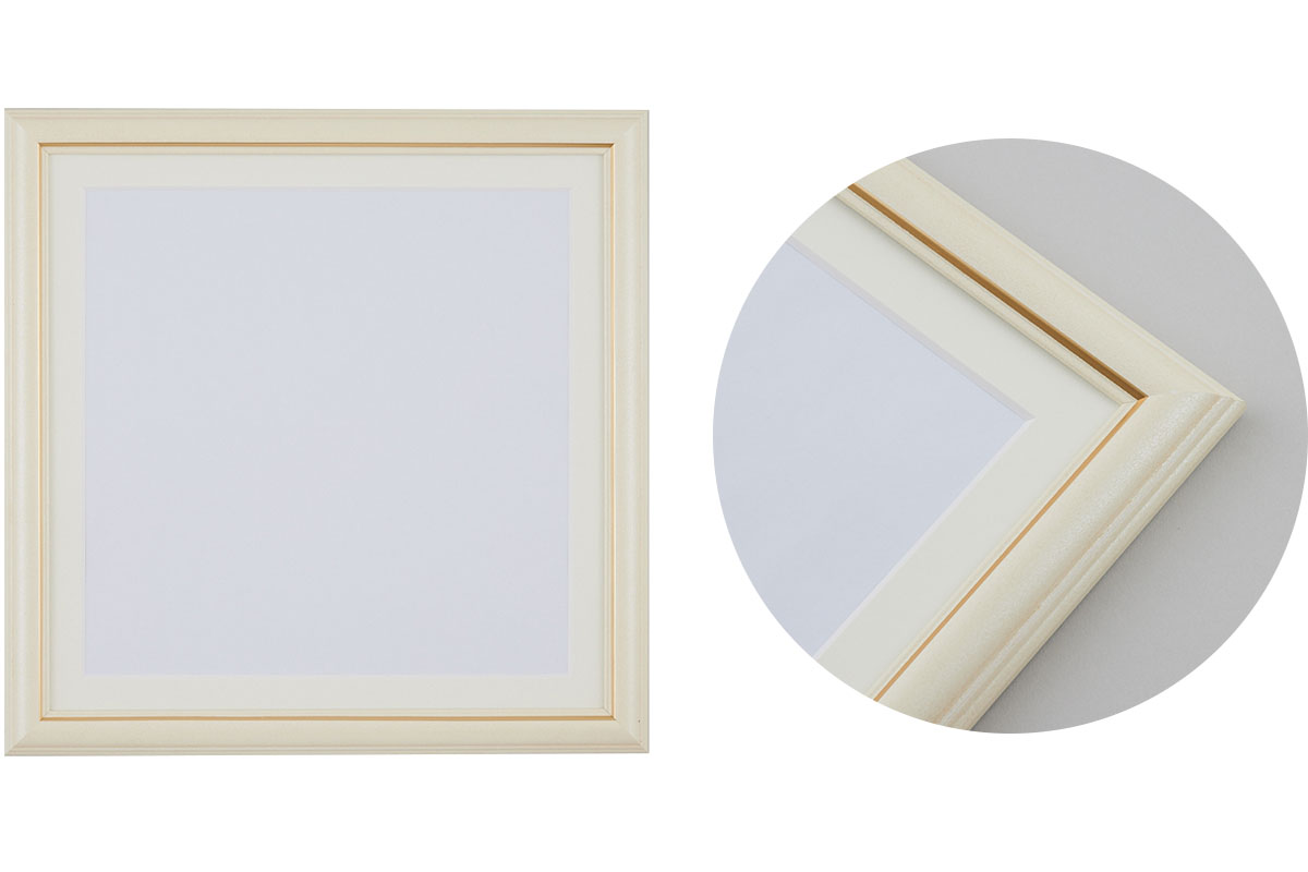 デザイン面:中マットあり 30×30cm・中マットなし 36×36cm光沢のある白にゴールドのラインが入った、シンプルながらも作品に華やかさを添える額です。●フレーム:色/アイボリー×ゴールド、素材/樹脂●中マット/クリーム●ガラスつき