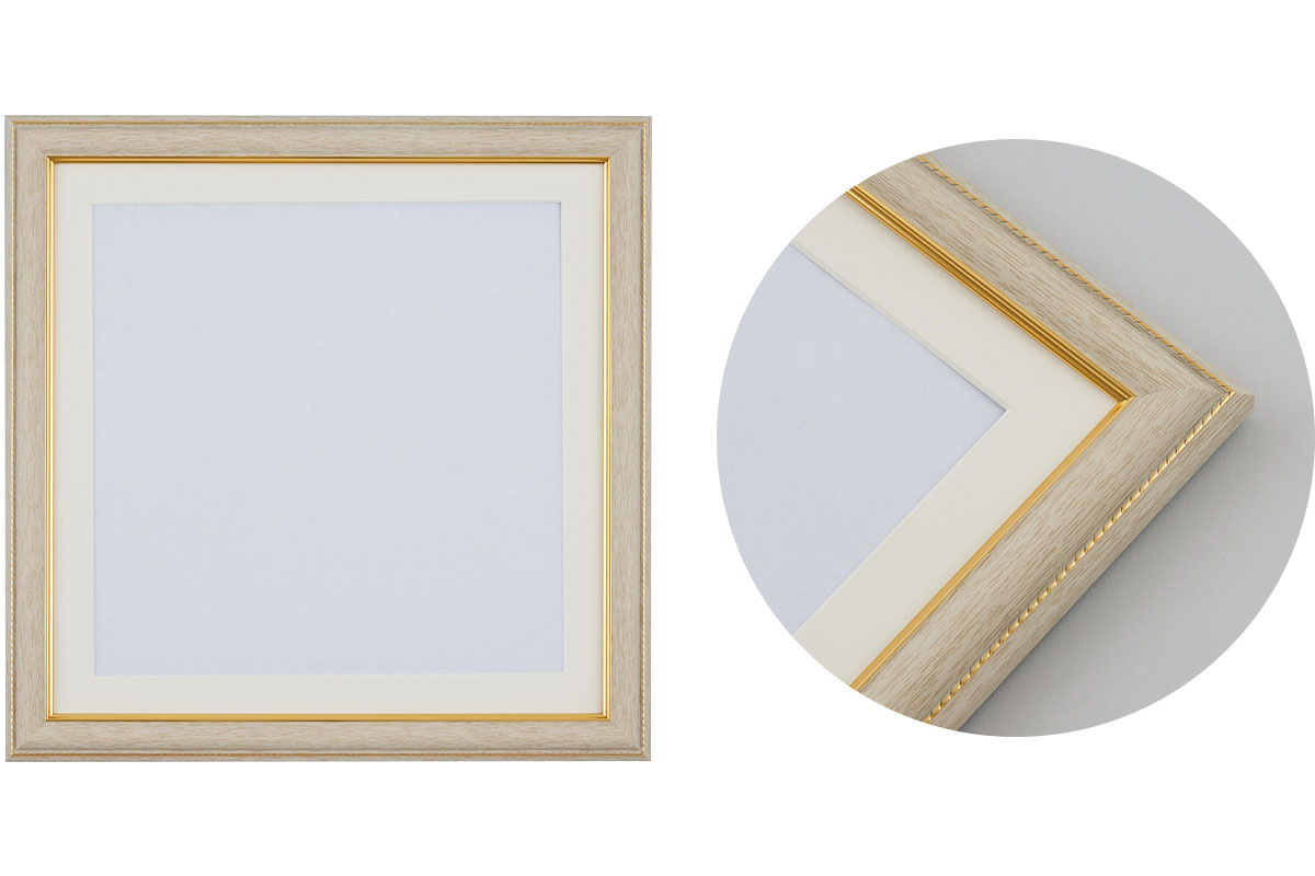 デザイン面:中マットあり 30×30cm・中マットなし 36×36cmニュアンスのあるアイボリーとゴールドの組み合わせで、洗練された上質な雰囲気のある額です。●フレーム:色/アイボリー×ゴールド、素材/樹脂●中マット/クリーム●ガラスつき