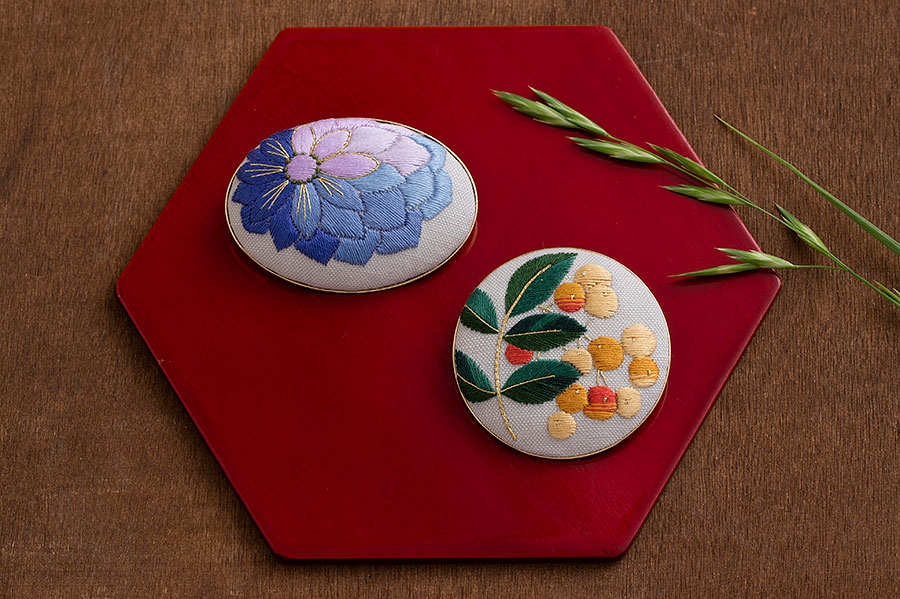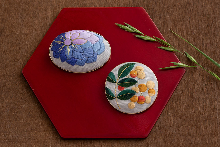 日本刺繍 帯留めブローチ(花・南天) 沖 文