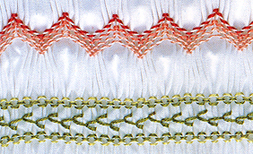スモッキングは、布地にひだを寄せた折り山に刺す刺しゅうです。スモック(smock)とも呼ばれ、17世紀ごろの直線裁ちにした衣類の余分な布をしわづけして身にまとっていた婦人用肌着でした。それが装飾的になり、北欧や東欧で民族衣装として生き続けています。現在でも、薄手の木綿からウールまで、無地・水玉・縞・格子などを用います。