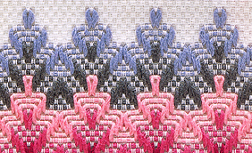 古代ビザンチン時代に、イタリアを経てヨーロッパから全世界に広がったという古い歴史を持つ刺しゅうです。布目を数えながら表面に2本の糸を交差させます。糸は中央で交差し、交差の方向を一定に並べて刺します。
