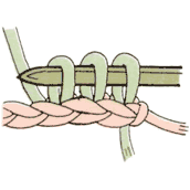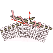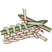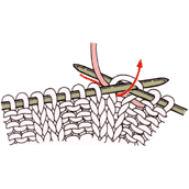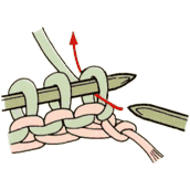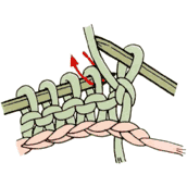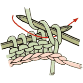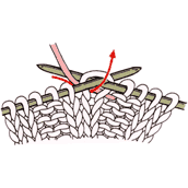 3記号図の反対の編み目(裏目)で編みます。糸を手前に置き、端の目に矢印のように針を入れます。