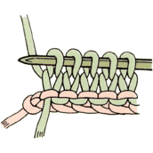 表目だけの編み地です。表から編む段は表目、裏を見て編む段は裏目で、1段ごと交互に編みます。ここでは別鎖の拾い目から説明しています。