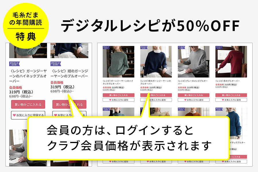 年間購読をお申込みの「毛糸だまクラブ」会員の方は、ログイン後に画像のようにクラブ会員価格が表示されます。