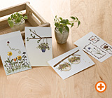 押し花はがきで季節の便りを贈ったり、コースターやティーマット、お部屋のドアに掛けるウッドプレートなど、日頃の生活に使える作品作りをお楽しみいただいています。