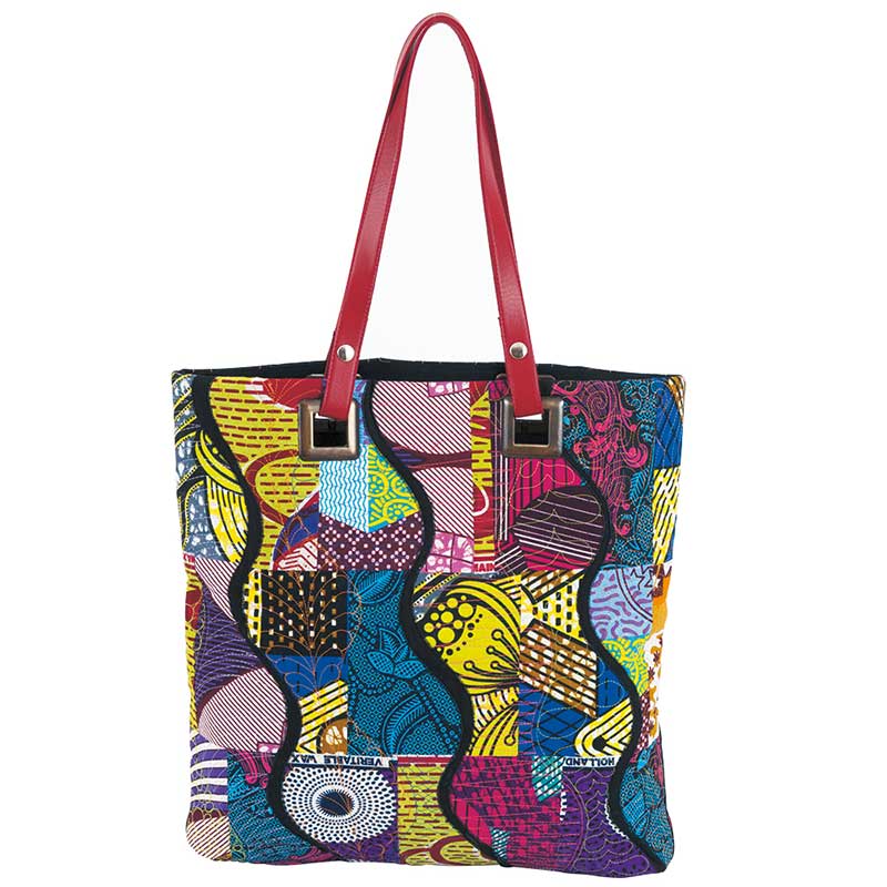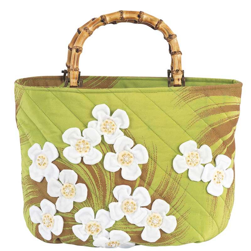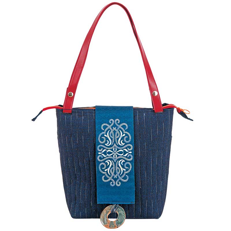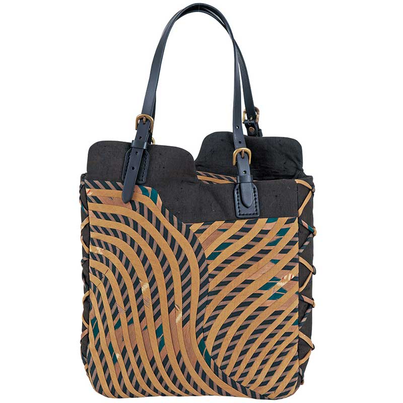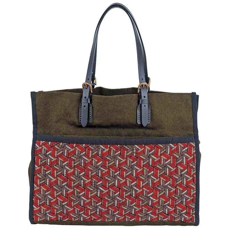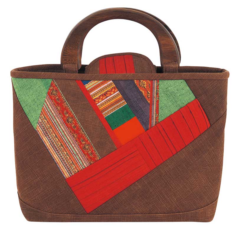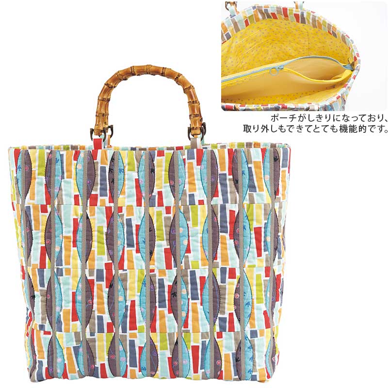 - バンブーの持ち手の軽やかさとバッグ部分の節のあるパターンや配色がバランスのよい作品だと思います。中に取り外せるポーチをつけているのも機能的だと思います。