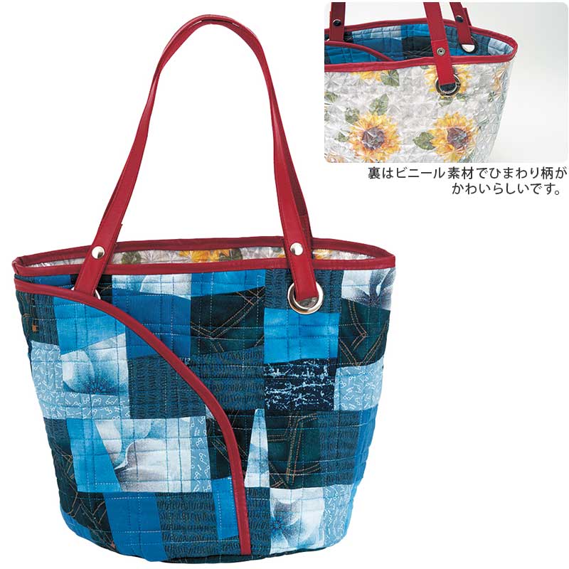 - 表はクレージーキルトと青に赤いラインを入れ、裏はひまわり柄に赤いふちをに合わせてみました。(コメント一部抜粋)