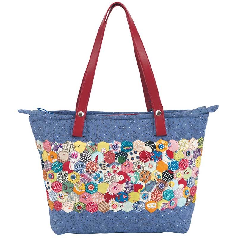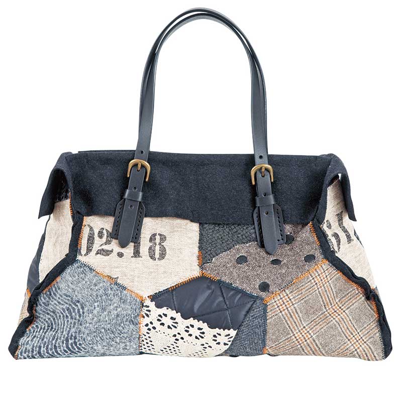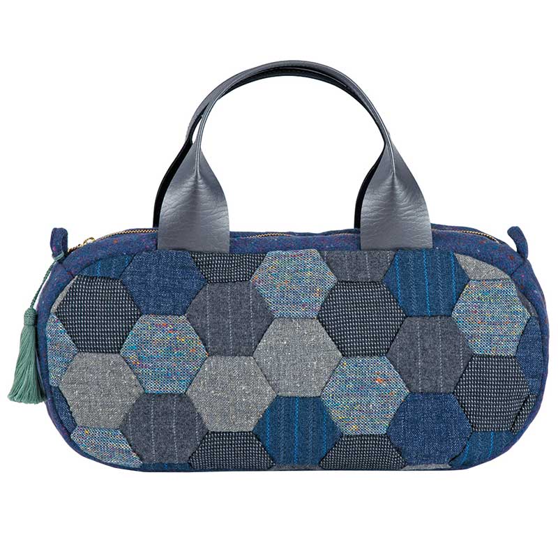 - 大好きな異素材をつなぎ合わせた生地をヘキサゴンにカットして、バッグの形になるように自由に縫いつけていきました。