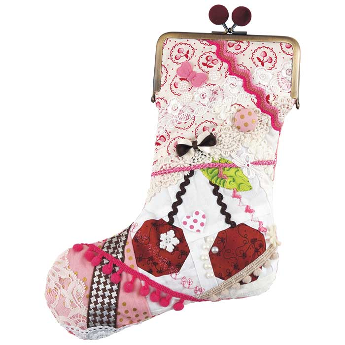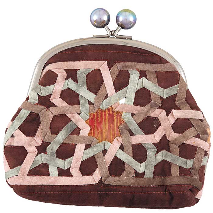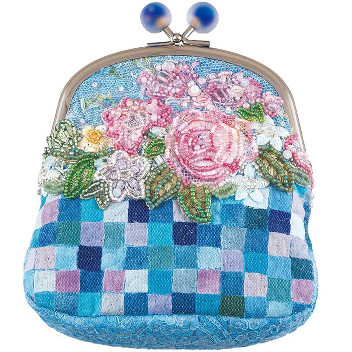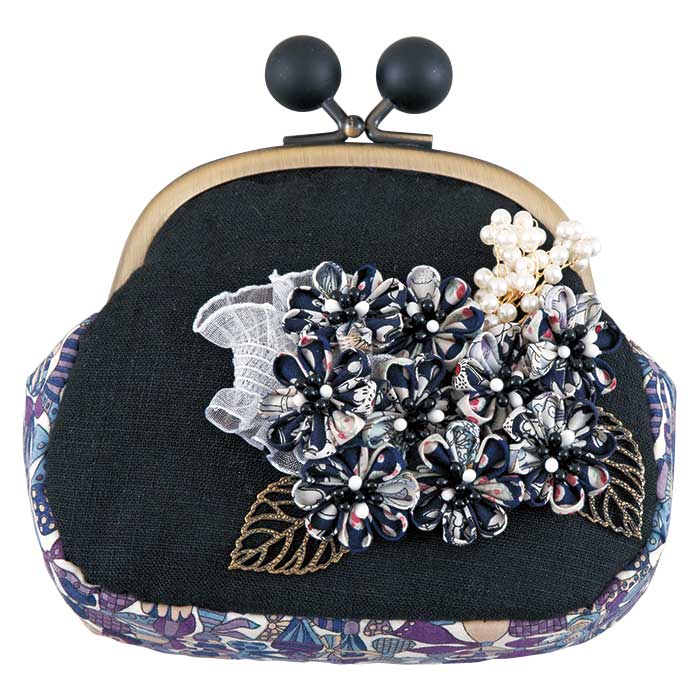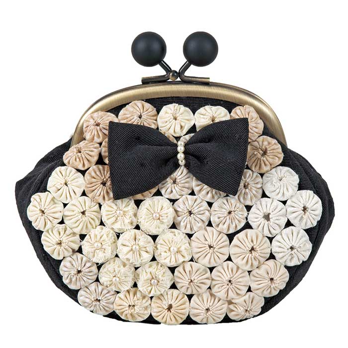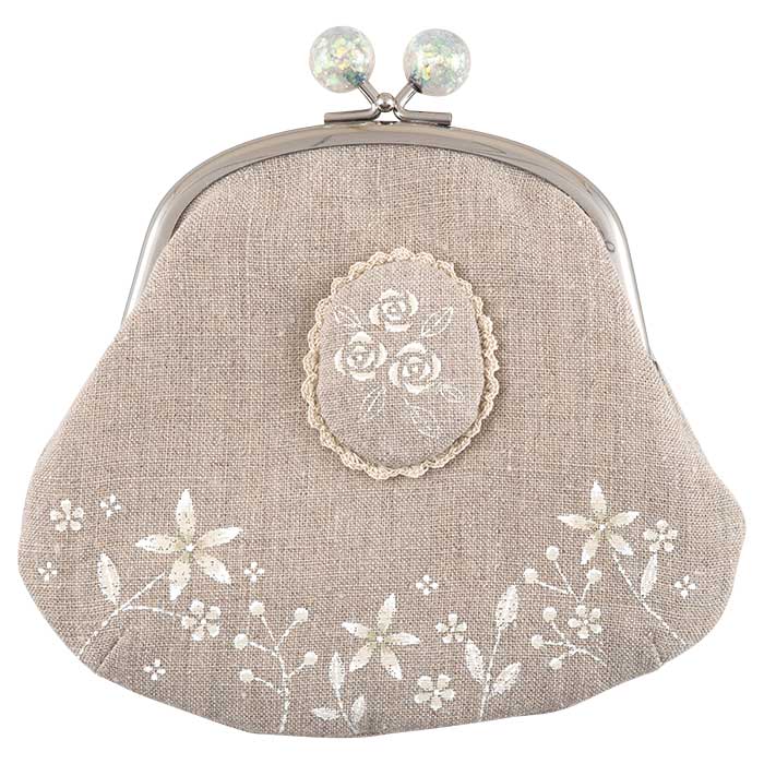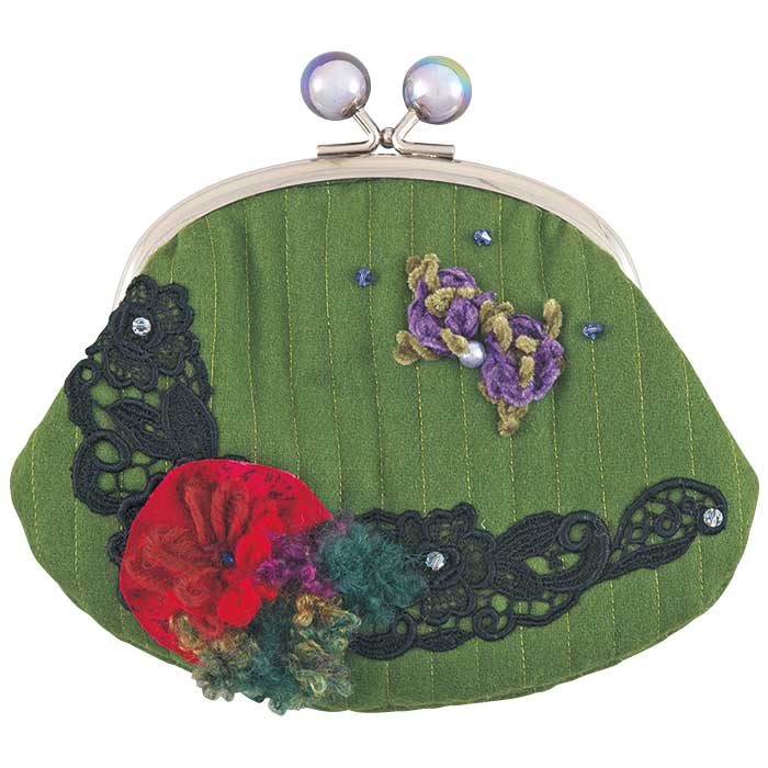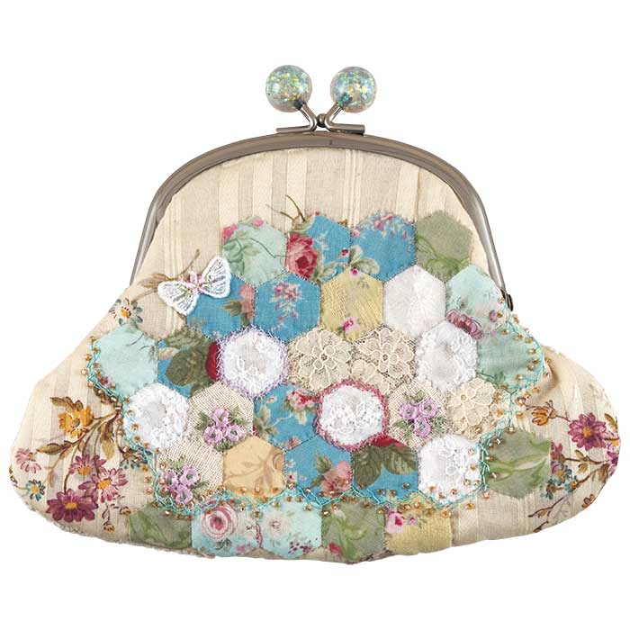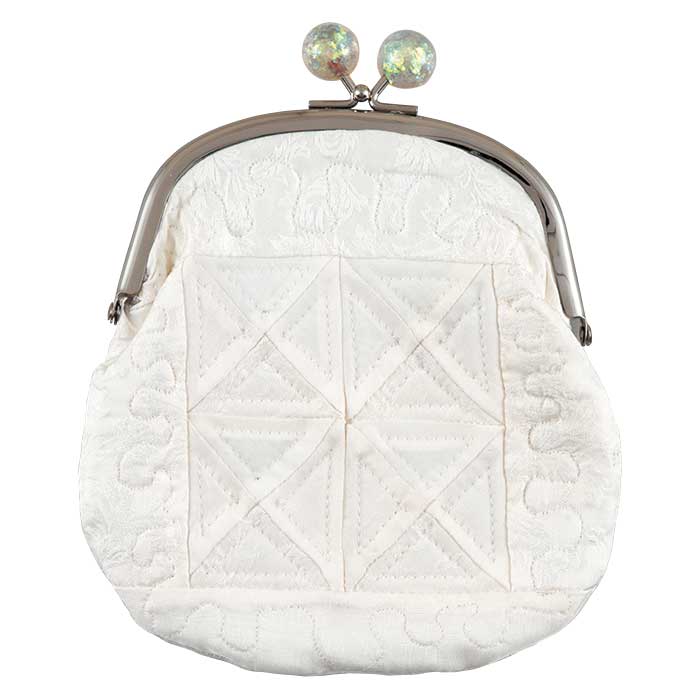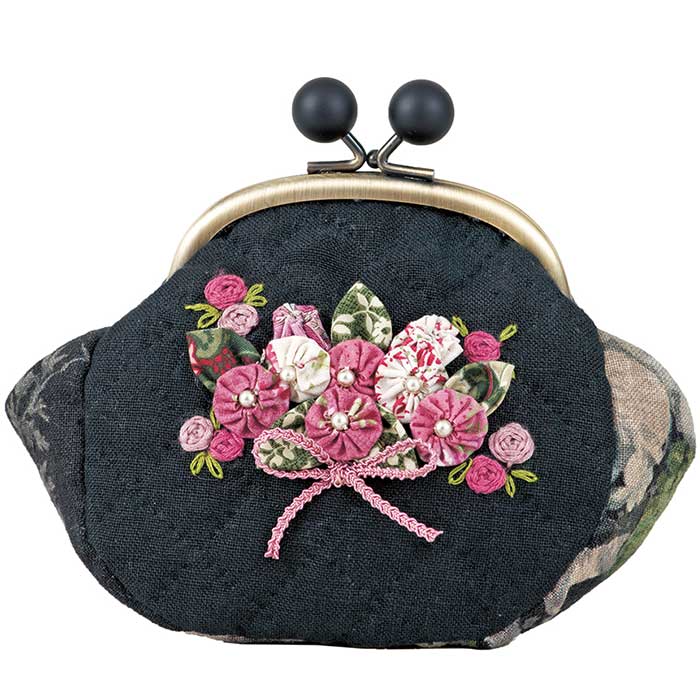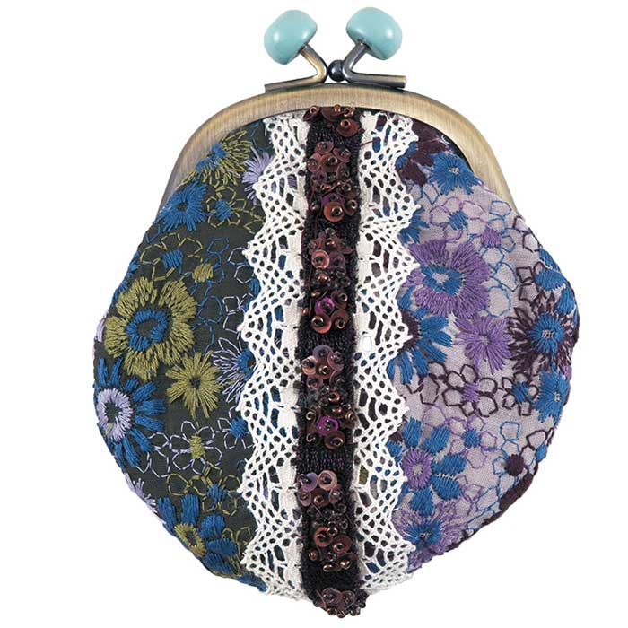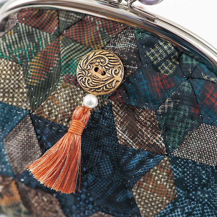 がま口の小さな面に細かいピースワークをされていて手の込んだ作品です。レース地やビーズなどの飾りが良いですね。口金とも合っています。