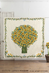 明るいひまわりを大きな花束にしてアップリケ。丁寧な手仕事が印象的です。ボーダーはひまわりとアイビーをあしらいました。ブルーの花がアクセントに。