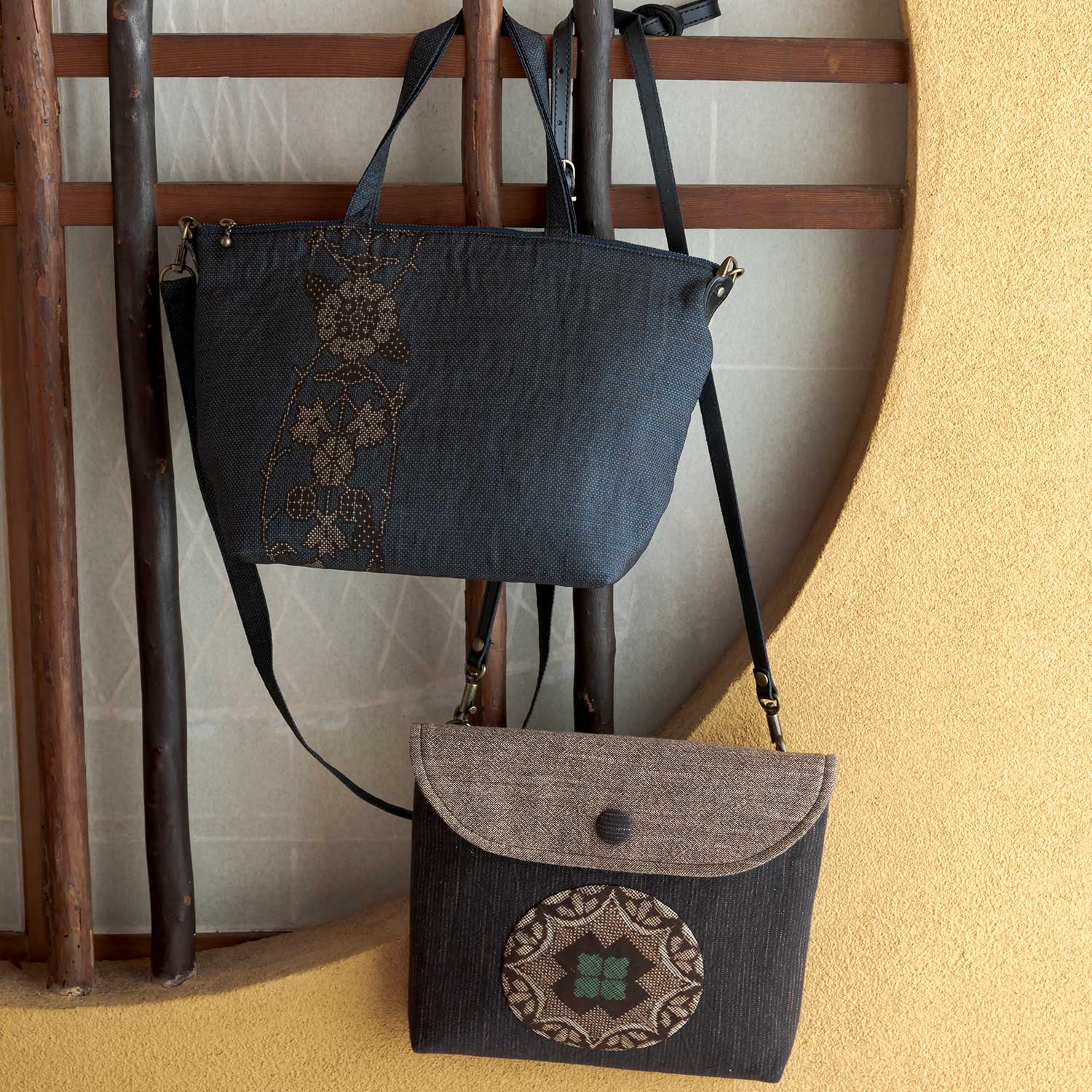 大島紬の2ウェイバッグと着物柄をアップリケしたバッグ大島紬の色柄をそのまま生かした、洋服にも和服にも合うシックなバッグです。 作り方はこちら