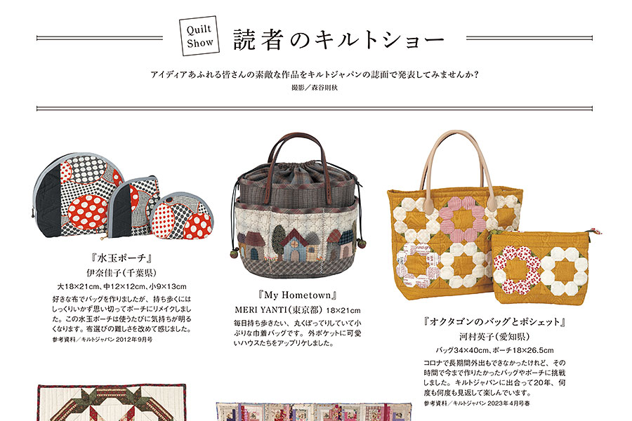 キルトジャパン「読者のキルトショー」ではあなたの作品を募集しています。パッチワークキルトの技法を用いたものであれば、タペストリーでもバッグでも構いません。キルトジャパンであなたの自信の一作を発表しませんか?
