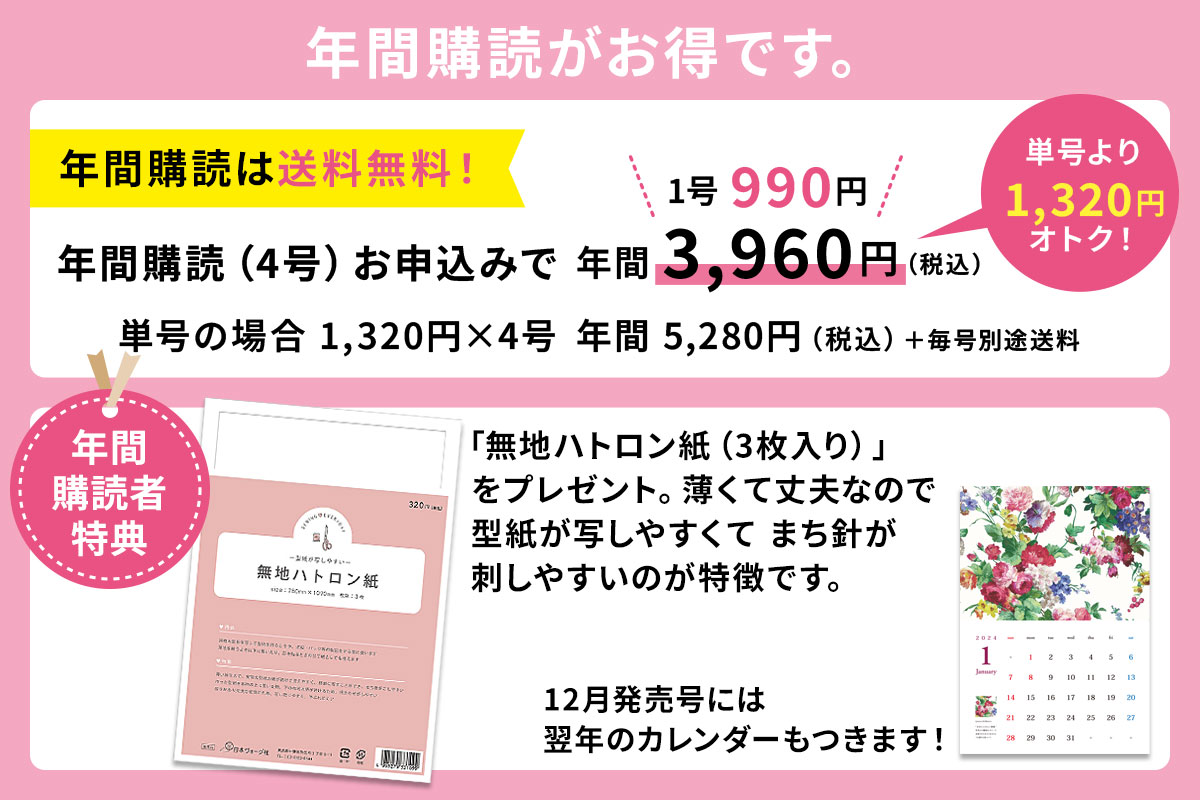 - 4毎号全作品の実物大型紙が2枚ついています