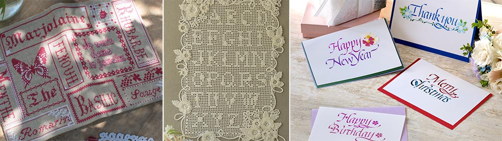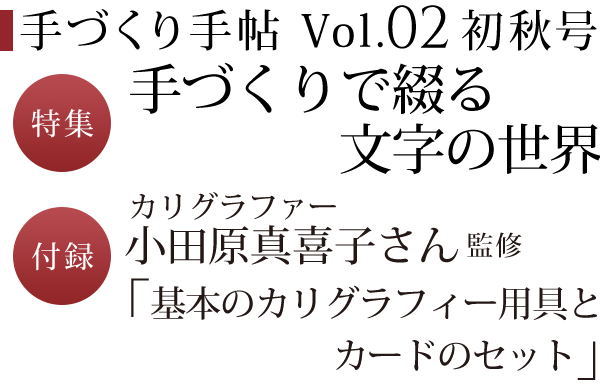 人類が生み出した偉大な造形、文字。文字は美しさと創造の余地に満ちて人々を魅了し続け、紙に布に木に、さまざまに綴られてきました。カリグラフィー、メタルエンボッシング、ペイント、刺しゅう、キルト、編み物…、文字で綴られた愛すべき手づくりの世界をお届けします。