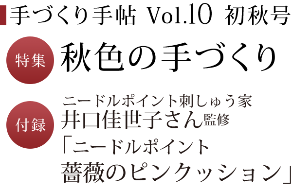 手づくりにぴったりな季節の到来です。そこで、井口佳世子さんが伝える英国流ニードルポイント刺しゅう、下田直子さんが贈る刺しゅうやかぎ針編みモチーフのバッグ、岡まり子さん、岡本真希子さん、鳥居節子さんによる秋色をのせたウエアラブルニット、大西和子さんの刺しゅうレース生地で作るパッチワークなど、さまざまな手芸で綴る“秋”をお届けしましょう。