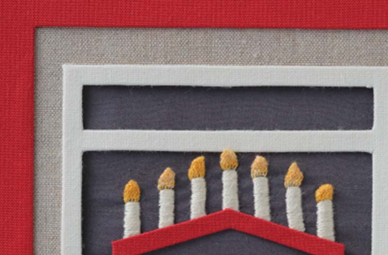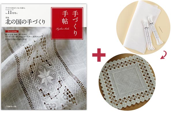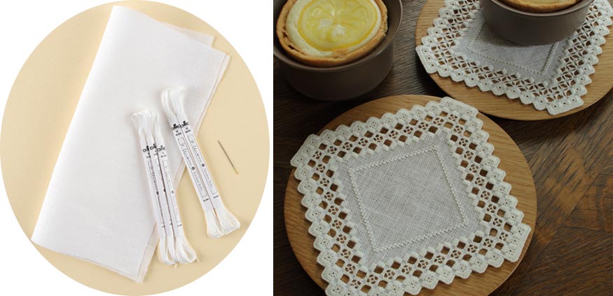 布の織り糸を抜き、かがって作るハーダンガー刺しゅう。御園二葉さんが、2つの麗しい図案によるコースターを紹介してくれました。必要な材料の、リネン布、アブローダー糸、刺しゅう針をセットしてあります。