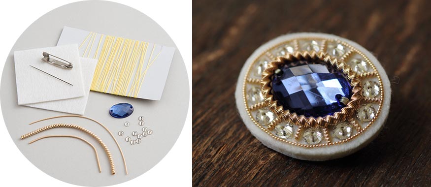 ゴールドワークならではのコイル状メタル糸をはじめ、ビジューカットのビーズやクリスタルビーズなど、なかなかそろえにくい材料から、ブローチピンや縫い針までもがセット済みなので、すぐに作り始められます。
