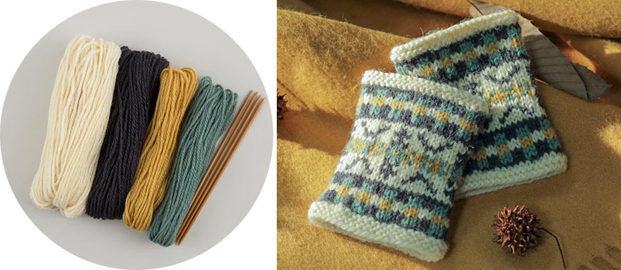 4色の毛糸で、フェアアイル風の模様を編み込んでいくリストウォーマーを作りましょう。4本棒針もセットに含まれるので、編み物が初めての方でも大丈夫です。