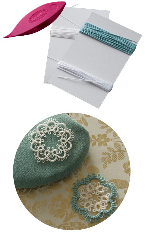 初夏号の材料セットは盛本知子さんがデザインした「タティングのシャトル」と小花モチーフが作れる白の「レース糸」。練習用の少し太い「レース糸(2色)」もついています。