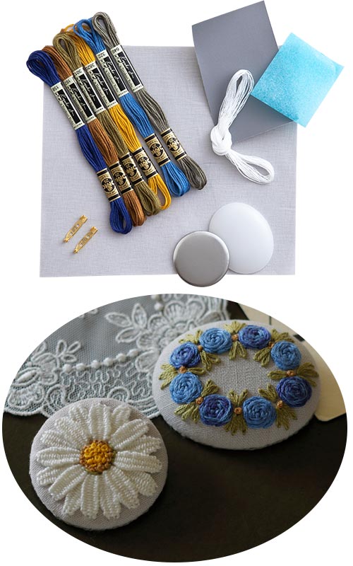 材料セットは青木和子さん監修の「花咲く刺しゅうブローチ」円と楕円の2個セットです。小さな円と楕円の上に可憐な花を咲かせてくれました。きれいな色合いで、夏の装いにぴったりです。ぜひお試しください。