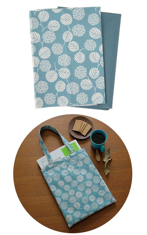 岡さんが本誌のために特別にデザインしてくれた花模様の布で作ります。グレイッシュなブルーは、明るさの中に落ち着いた雰囲気を兼ね備えています。A4書類はもちろん、『手づくり手帖』も入るサイズで使い勝手も抜群。裏布・内ポケット用として、汚れにくいナイロンオックス布もセットされています。