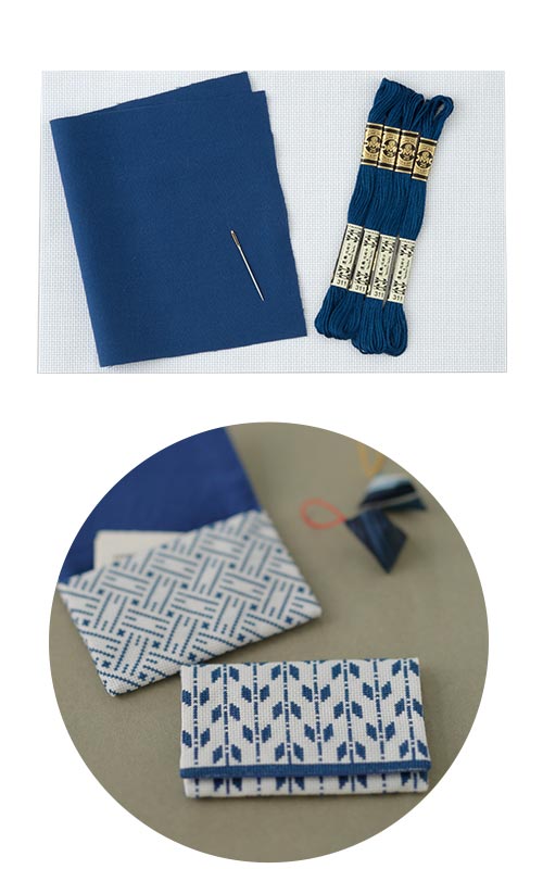 遠藤佐絵子さん監修の「クロスステッチの和模様のカードケース」。ショップカードやポイントカードを入れるのに便利なケースです。模様は「矢羽根」と「網代」の2種類をご用意しました。お好きな方をお作りください。
