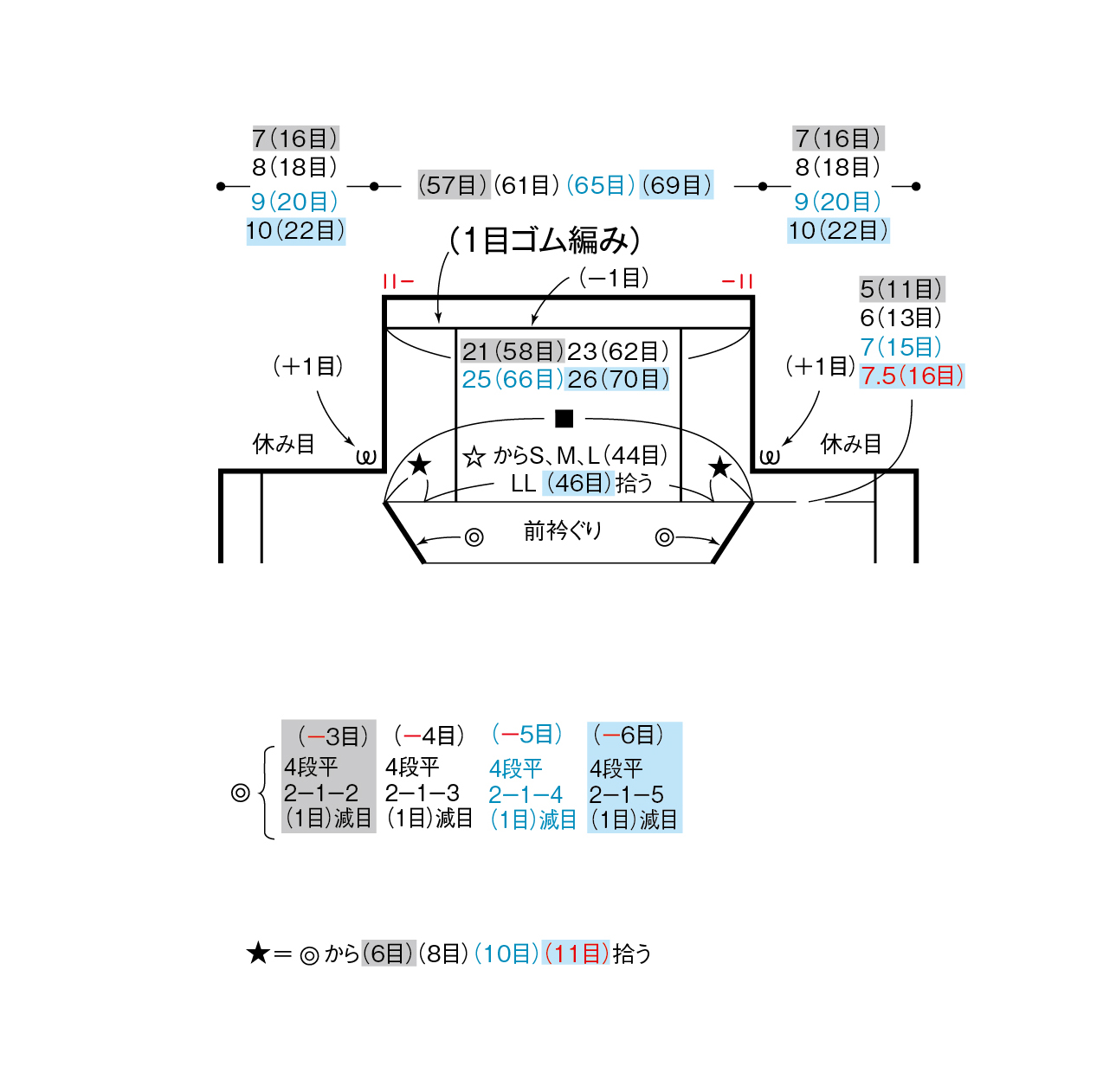 【2目ゴム編み】【ガーター編み】【メリヤス編み】は、省略部分がすべて表目になります。