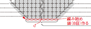 編み始めの鎖の作り目を編んだら糸を切り、新しく糸をつけて鎖の両側から拾って1段めを編みます。