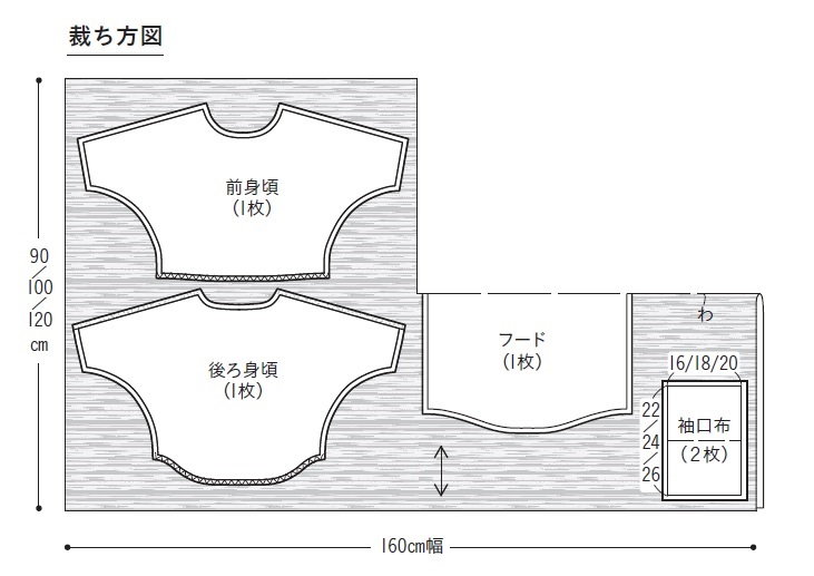 フードの布目を実物大型紙に合わせて裁ってください。