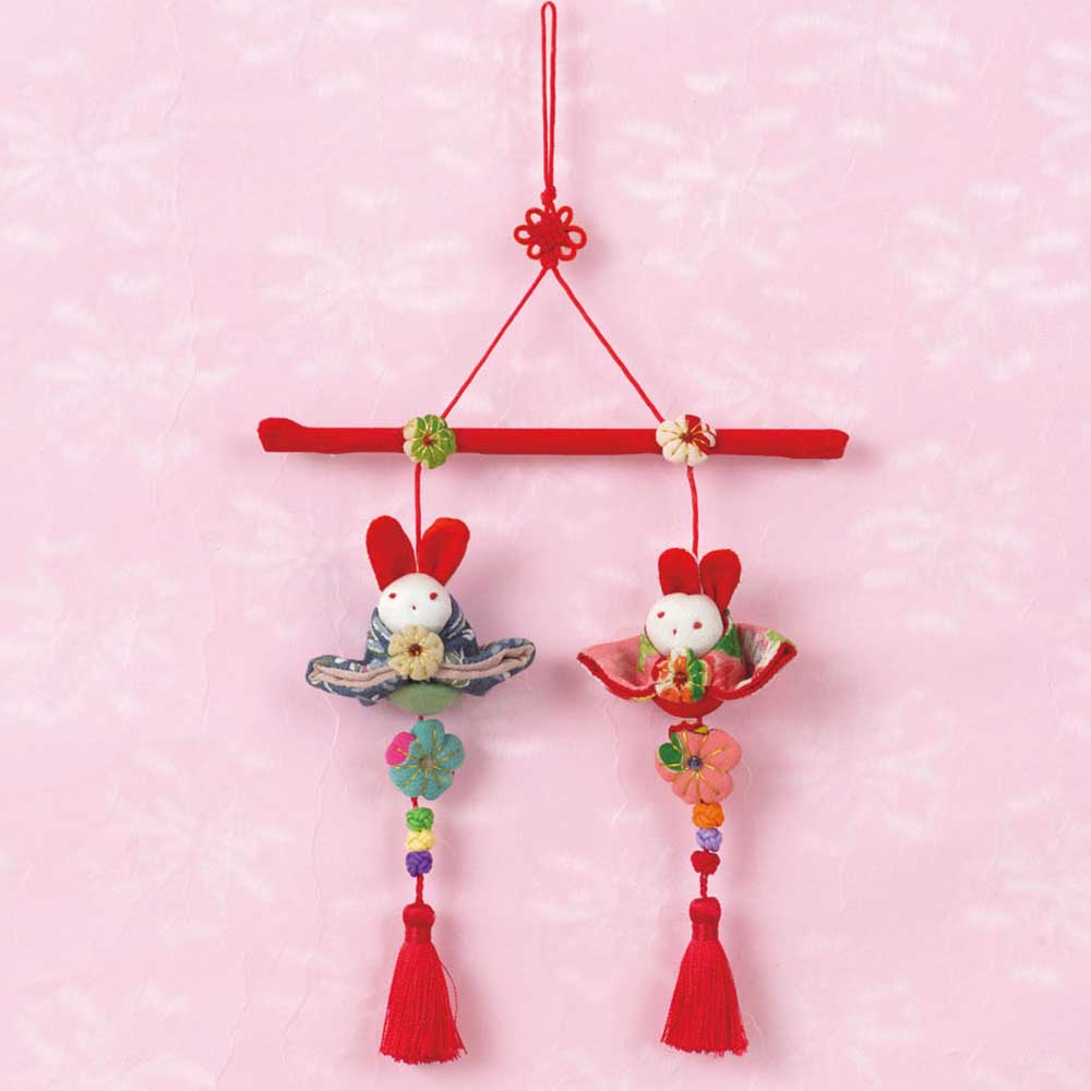 【キット作り方つき】 【古裂】可愛らしいペアのウサギがゆらゆら揺れる、ミニサイズのつるし飾りです。タッセルがポイントに。
