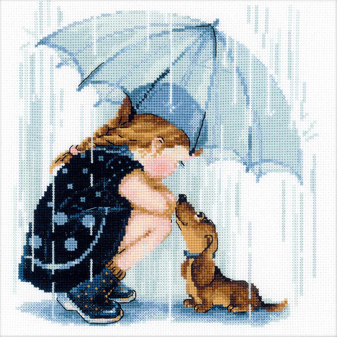 雨の中の少女と可愛い子イヌの心温まる光景を描きました。25番刺しゅう糸と、ふっくらした極細毛糸でクロスステッチします。初~中級の方向き。