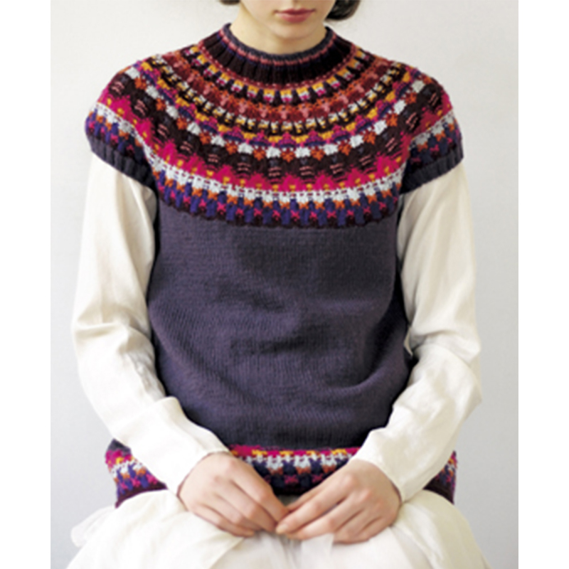 丸ヨークの編み込み模様に、さらに裏目を組み合わせることで、複雑なテクスチャーが生まれます。ビビッドな色使いが効果的なプルオーバー。